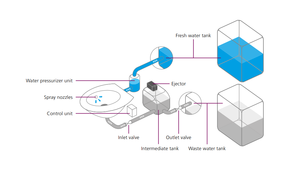 Super efficient at just 0,5 l water per flush and engineered to ensure optimum performance using small tank volumes, the Trainvac Compact is an excellent and economical stand-alone solution. Its integrated fault detection and troubleshooting as well as super-easy installation and maintenance make it a worry-free system: The entire unit can be replaced within 10-15 minutes.